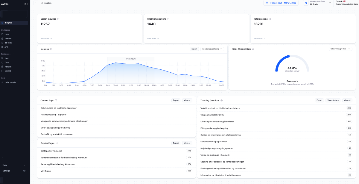 Understand when users self-service by examining average peak days for search inquiries, aiding in planning and resource allocation. The number displayed shows the trends for inquiries within the chosen timeframe.