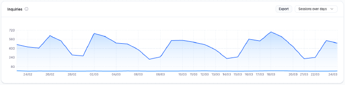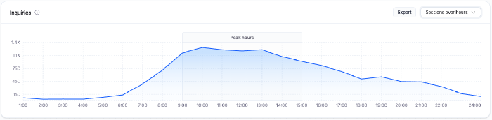 Track the peak hours for search inquiries and use it as a tool for understanding and planning for resource allocation. The number displayed shows the trends for inquiries within the chosen timeframe.