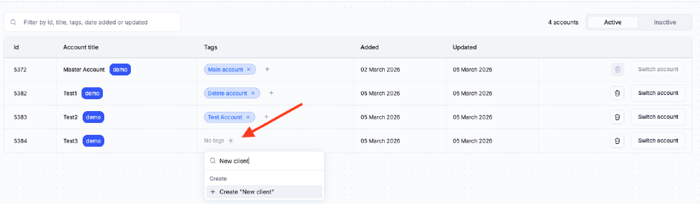 To add labels to your child/sub accounts - go to your account overview list, and press the “+” sign under tags. Here you can give the account any tag you want.
